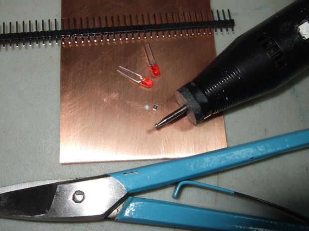 Solía 0,03" espesor de un solo lado pcb, 3mm LED, resistencias de montaje superficial 240R y SIP encabezado alfileres para hacerlos. El único truco es dejar las patillas en la cabecera hasta después de que se han soldado, con el fin de preservar el espacio. Y para conseguir que la pila de al lado, los lados del LED un poco con una Dremel.