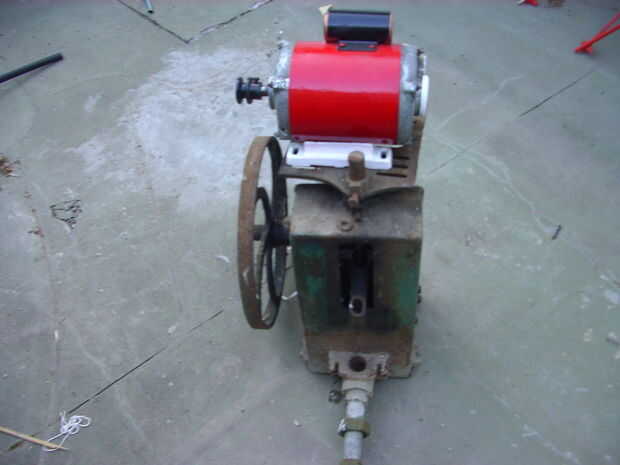 Pensamiento y el pensamiento, recordé había quedado encerrado en el patio trasero una vieja bomba de agua de la casa que mi hija compró hace unos años. Mi yerno lo llevó a cabo porque no fue usado y molesto, y lanzaría lejos. Ya que soy de los que no se deshaga de la cáscara de un huevo, lo pidió, en caso de que un día me sirve. Así que levanté la portada, vio que era con motor y todo, que conectado a 220 V y Aleluya! funcionó a la perfección. Por supuesto, tenía tanta suciedad que estaba triste. Empecé a restaurarlo, revisar por un experto quien confirmó que rodamientos no necesitan ningún reemplazo, lo limpié lo mejor que pude, lavar los rodamientos, había les había engrasado, agregó una tapa protectora para retener la grasa, cambié unos tornillos y finalmente le dio dos o tres capas de pintura. No sé qué tanto poder tiene, porque pierde la etiqueta de especificaciones, pero estimo 3/4 o 1 HP debido a su peso.