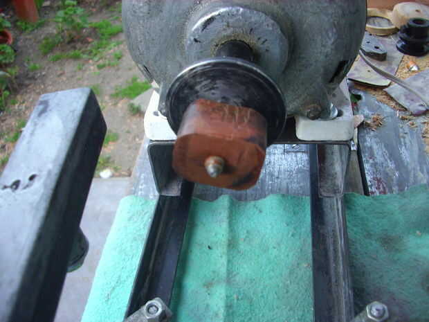 ¿ Lo que se utiliza como chuck? Al principio he pensado utilizar la polea pequeña que trajo el motor, pero luego me pensamiento significaba arruinarlo, y tener en casa muchos pedazos de tubo de hierro, lo mejor era hacer una pieza a medida. Tomé un tubo que casi no entrar en el eje, hizo un corte longitudinal, abrió un poco y cuando fue moldeada en el eje, soldar una tuerca para apretar el eje con un tornillo. En un extremo de este tubo soldar un par de arandelas de espesor grandes y en el agujero central de estos, tres arandelas más pequeñas, que a su vez habían soldado un lag bastante robusto. Después he añadido una nuez de madera dura, usado para sostener las piezas planas de madera. Más adelante voy a hacer otros platos, para diferentes tareas.