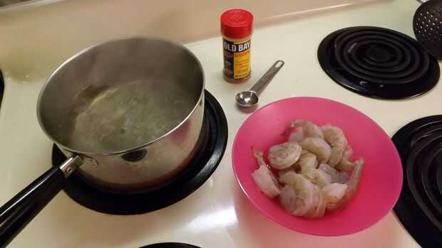 3. Añadir 1 cucharadita de sazonador de mariscos Bahía viejo a hervor, luego agregue los camarones crudos.
