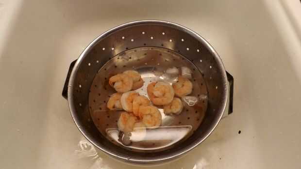 5. Después de que los camarones han refrescado en el baño de hielo durante un par de minutos, drenaje, seque y apartar mientras preparar la tortilla (ver siguiente paso).