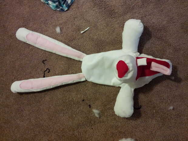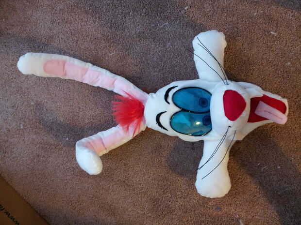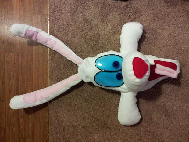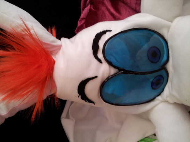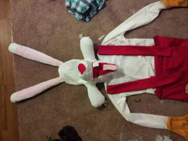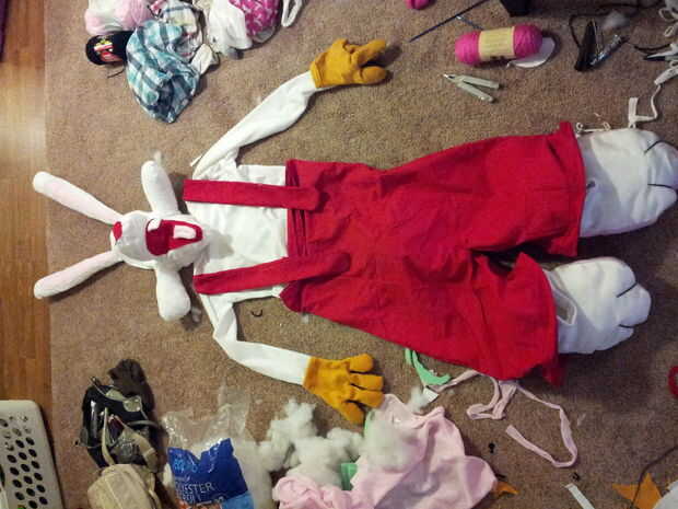 Encontrar una peluca roja orangeish barata y cortar una pieza para el penacho del pelo en la parte superior de la cabeza... Corte una abertura en la parte superior y caliente lo pegué en la cabeza!! Cómo usted debe tener una cabeza de Roger Rabbit!