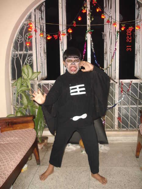 disfraz esqueleto usando pintura y papel de congelador.Materiales:camisa de manga larga negropolainas o johns largopintura de tela blancapapel de congeladorlápizhierropintura tela brilla en la oscuridad (opcional)Paso 1: Dibujar los huesos Dibujar al
