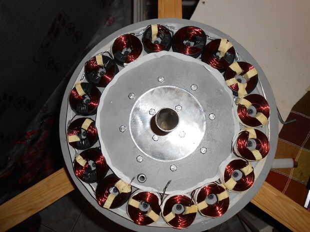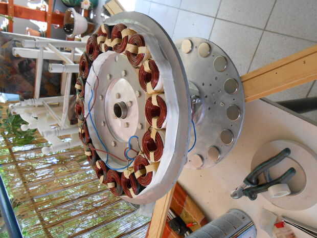 este aerogenerador fue hecha sobre todo de una fotocopiadora desmantelada incluyendo los 2 grandes motores y engranajes.La turbina produce 12Watts en normally(wind10-20km) 10-16v. Cuando el viento sopla un poco more(20-25km/h) puede producir más de 2