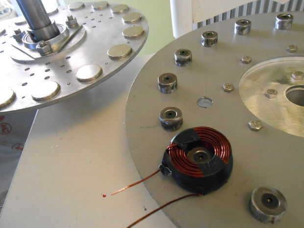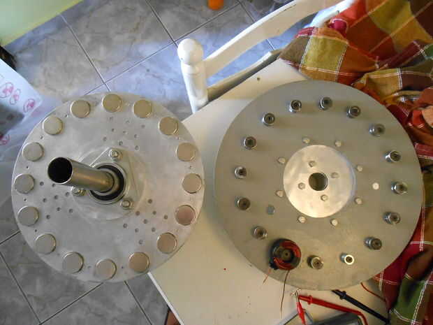 este aerogenerador fue hecha sobre todo de una fotocopiadora desmantelada incluyendo los 2 grandes motores y engranajes.La turbina produce 12Watts en normally(wind10-20km) 10-16v. Cuando el viento sopla un poco more(20-25km/h) puede producir más de 2