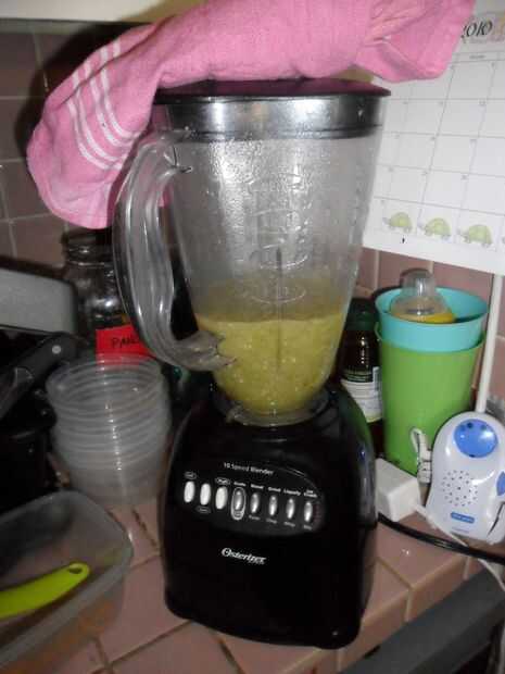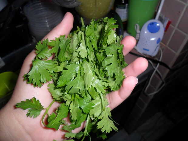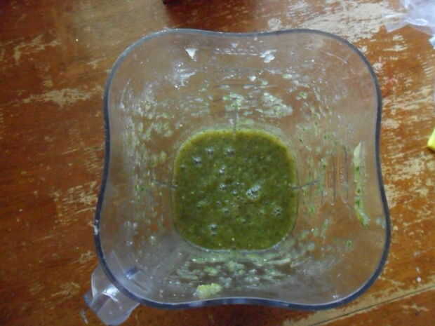 Esto hervir hasta que las verduras estén tiernas, unos 15 minutos o así. Con una espumadera, añadir a la licuadora. Añadir alrededor de 1/4 taza de caldo de verduras en la licuadora. Licue a alta durante 2 minutos. Añadir el puñado de cilantro y mezcla por 2 minutos en high. Agregar sal y comino y mezclar.