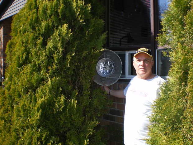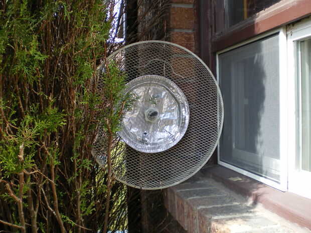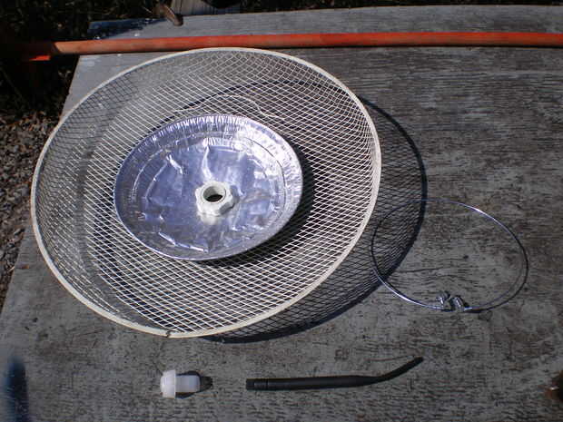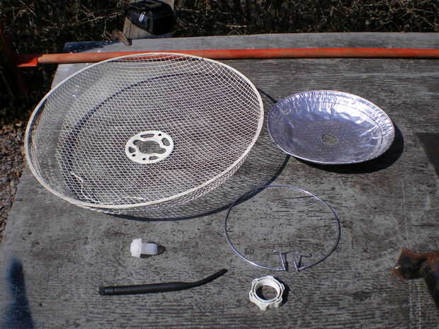 Así que nos dispusimos a encontrar piezas para la construcción, todo se encontró en su garaje... es uno de esos tipos que nunca nada tira. Encuentra una rejilla plástica redonda de un viejo ventilador giratorio. A continuación un aluminio pie placa, un corcho de champagne plástico, un anillo de cable antena saqué de mi vieja 10' blanco y negro TV me he reservado alrededor de la creación de sistemas de aire libre y un 5' longitudes de cable SMA y la antena que se conecta a mi Rangebooster G desktop adapter.
