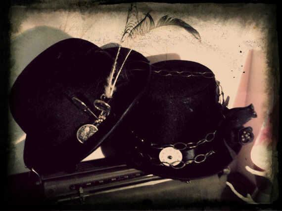 compré los sombreros en el ensamblándolos para $2 cada uno, encontró un viejo roto watch, lo llevó aparte, sembradas la cara placa al sombrero, compró alguna cadena de la tienda de artesanía que cosen en así y compró unas rosas negras pegan algunas cuentas de bronce en el y sembró entonces en. y eso es básicamente todo. mezclar y emparejar y divertirse. ^ ___ ^