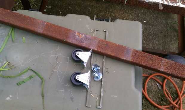 fui a Home Depot, que es sólo una tienda de caja grande, sólo porque eran lo más cercano a mi casa. Quería mantener el costo de esta reparación baja y planificada en encontrar mi montón de chatarra para algunas de las partes, pero no pude encontrar las ruedas ni los pernos en el montón de chatarra. En la ferretería he comprado 2-2" ruedas fijas y 2-5/16 pernos con arandelas y tuercas. En total $5. No para mal. Las piezas y suministros tuvieron que ser más barato entonces solo compra el repuesto. Yo incluso no ver cuánto la sustitución sería después de determinar que la reparación sería tan barata. De mi montón de chatarra encontré un pedazo de tubo de 1 x 2 que fue lo suficientemente largo.