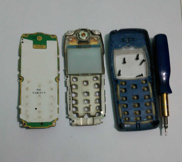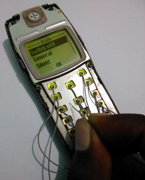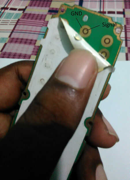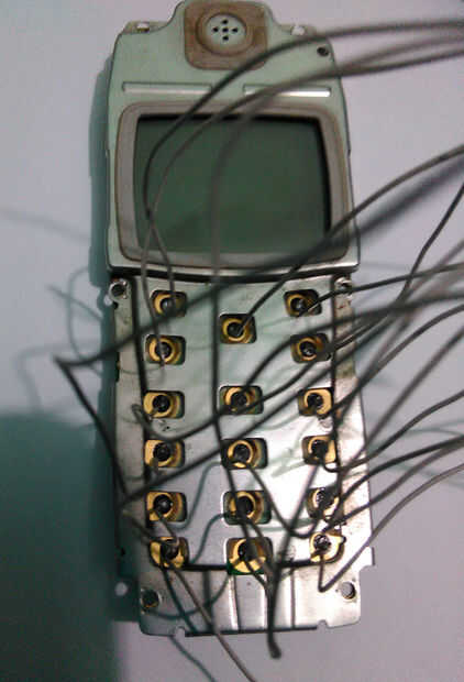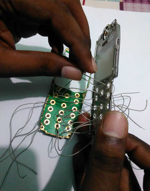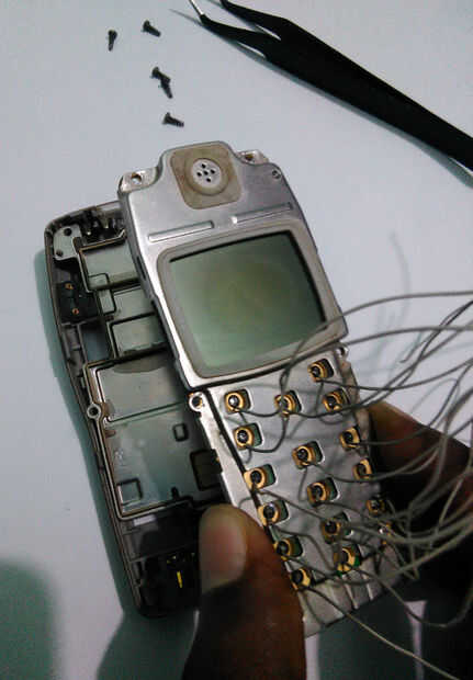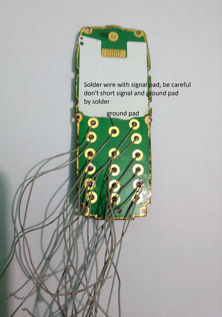 Abra la carcasa del teléfono. Quite el tornillo con el destornillador. Retire el aislamiento plástico arriba del teclado del teléfono. Ahora soldadura fina (yo usé alambre de conexión de disco duro antiguo IDE cable) cable aislado a la almohadilla de la señal de cada botón. Cojín de punto interior es señal y pad circular externa es cojín de tierra. Cuando la soldadura tenga cuidado no corto tierra cojín y señal de cojín con la soldadura. Ahora soldar un cable con el cojín del suelo.