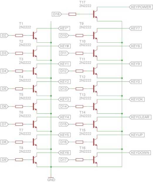 Sobre el esquema muestra cómo arduino digital pins (D3 a D18) están conectadas a teclas de su teléfono. Que utiliza el transistor bipolar npn de propósito general (2N2222) para conmutación (encendido-apagado la tecla del teléfono). Cualquier otro transistor de npn de propósito general como el BC547, 548 puede ser utilizado. Pin de I/O digital de Arduino está conectado a la base del transistor a través de un resistor limitador actual. Un resistor 12 de k funciona bien. Cuando un pin digital de arduino alta el BJT encender y trabajar como una pulsación en la tecla del teléfono móvil. Si te interesa saber más acerca del transistor siguen el enlace: https://learn.sparkfun.com/tutorials/transistors. Usted puede encontrar la ficha técnica de 2N2222 aquí. Configuración de pines del 2N2222 es mencionada.
