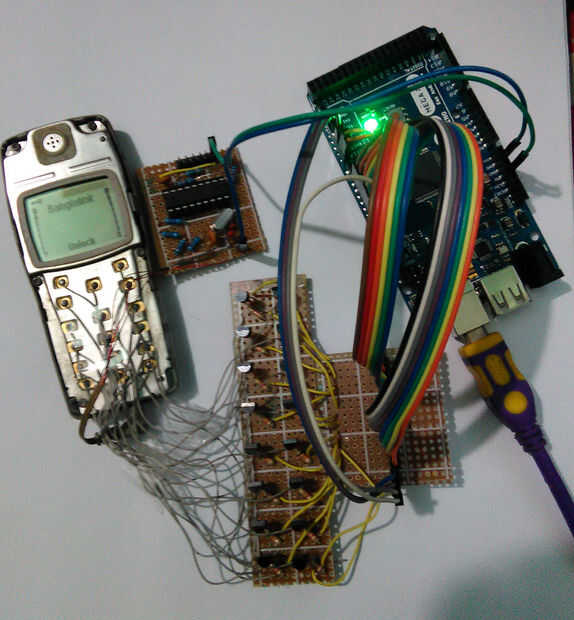 <code> int pressTime = 100; int pressDelay = 300; int holdTime = 1000; int typeTime = 100; int typeDelay = 400; int value[16] = {16,6,12,9,5,15,10,14,13,18,17,11,3,4,8,2}; char number[12]; char massegeChar[160]; int count = 0; int numCount = 0; int charDelay = 300; int numberState = 0; void setup() { // initialize the digital pin as an output. for(int i=2; i<20; i++) pinMode(i, OUTPUT); Serial.begin(9600); holdClear(); } // the loop routine runs over and over again forever: void loop() { while (Serial.available()>0){ char character = Serial.read(); if(character == '*'){ sentSMS(); count = 0; numCount = 0; numberState = 0; } if(character == ':'){ numberState = 1; numCount = 0; //delay(10); } if(numberState == 1){ number[numCount] = character; numCount++; } if(numberState == 0){ massegeChar[count] = character; count++; } if(character == '#'){ count = 0; numberState = 0; } } } void pressDigit(int digit){ digitalWrite(value[digit], HIGH); // press digit from 0 to 9 delay(pressTime); digitalWrite(value[digit],LOW); delay(pressDelay); } void pressOk(){ digitalWrite(keyOk, HIGH); // press ok delay(pressTime); digitalWrite(keyOk,LOW); delay(pressDelay); } void pressClear(){ digitalWrite(keyClear, HIGH); // press clear delay(pressTime); digitalWrite(keyClear,LOW); delay(pressDelay); } void pressStar(){ digitalWrite(keyStar, HIGH); // press star delay(pressTime); digitalWrite(keyStar,LOW); delay(pressDelay); } void pressUp(){ digitalWrite(keyUp, HIGH); // press up delay(pressTime); digitalWrite(keyUp,LOW); delay(pressDelay); } void pressDown(){ digitalWrite(keyDown, HIGH); // press down delay(pressTime); digitalWrite(keyDown,LOW); delay(pressDelay); } void pressHash(){ digitalWrite(keyHash, HIGH); // press hash delay(pressTime); digitalWrite(keyHash,LOW); delay(pressDelay); } void pressOff(){ digitalWrite(keyOff, HIGH); // press off delay(pressTime); digitalWrite(keyOff,LOW); delay(pressDelay); } void holdOff(){ digitalWrite(keyOff, HIGH); // hold off delay(holdTime); digitalWrite(keyOff,LOW); delay(pressDelay); } void holdClear(){ digitalWrite(keyClear, HIGH); // press clear delay(holdTime); digitalWrite(keyClear,LOW); delay(pressDelay); } void typeA(){ digitalWrite(key2, HIGH); delay(typeTime); digitalWrite(key2, LOW); delay(typeDelay); } void typeB(){ typeA(); typeA(); } void typeC(){ typeA(); typeA(); typeA(); } void typeD(){ digitalWrite(key3, HIGH); delay(typeTime); digitalWrite(key3, LOW); delay(typeDelay); } void typeE(){ typeD(); typeD(); } void typeF(){ typeD(); typeD(); typeD(); } void typeG(){ digitalWrite(key4, HIGH); delay(typeTime); digitalWrite(key4, LOW); delay(typeDelay); } void typeH(){ typeG(); typeG(); } void typeI(){ typeG(); typeG(); typeG(); } void typeJ(){ digitalWrite(key5, HIGH); delay(typeTime); digitalWrite(key5, LOW); delay(typeDelay); } void typeK(){ typeJ(); typeJ(); } void typeL(){ typeJ(); typeJ(); typeJ(); } void typeM(){ digitalWrite(key6, HIGH); delay(typeTime); digitalWrite(key6, LOW); delay(typeDelay); } void typeN(){ typeM(); typeM(); } void typeO(){ typeM(); typeM(); typeM(); } void typeP(){ digitalWrite(key7, HIGH); delay(typeTime); digitalWrite(key7, LOW); delay(typeDelay); } void typeQ(){ typeP(); typeP(); } void typeR(){ typeP(); typeP(); typeP(); } void typeS(){ typeP(); typeP(); typeP(); typeP(); } void typeT(){ digitalWrite(key8, HIGH); delay(typeTime); digitalWrite(key8, LOW); delay(typeDelay); } void typeU(){ typeT(); typeT(); typeT(); } void typeV(){ typeT(); typeT(); typeT(); } void typeW(){ digitalWrite(key9, HIGH); delay(typeTime); digitalWrite(key9, LOW); delay(typeDelay); } void typeX(){ typeW(); typeW(); } void typeY(){ typeW(); typeW(); typeW(); } void typeZ(){ typeW(); typeW(); typeW(); typeW(); } void space(){ digitalWrite(key0, HIGH); delay(typeTime); digitalWrite(key0, LOW); delay(typeDelay); } void sentSMS(){ holdClear(); holdClear(); pressOk(); pressOk(); pressOk(); for(int i = 0; i< 160; i++){ switch(massegeChar[i]){ case 'A': case 'a': typeA(); delay(charDelay); break; case 'B': case 'b': typeB(); delay(charDelay); break; case 'C': case 'c': typeC(); delay(charDelay); break; case 'D': case 'd': typeD(); delay(charDelay); break; case 'E': case 'e': typeE(); delay(charDelay); break; case 'F': case 'f': typeF(); delay(charDelay); break; case 'G': case 'g': typeG(); delay(charDelay); break; case 'H': case 'h': typeH(); delay(charDelay); break; case 'I': case 'i': typeI(); delay(charDelay); break; case 'J': case 'j': typeJ(); delay(charDelay); break; case 'K': case 'k': typeK(); delay(charDelay); break; case 'L': case 'l': typeL(); delay(charDelay); break; case 'M': case 'm': typeM(); delay(charDelay); break; case 'N': case 'n': typeN(); delay(charDelay); break; case 'O': case 'o': typeO(); delay(charDelay); break; case 'P': case 'p': typeP(); delay(charDelay); break; case 'Q': case 'q': typeQ(); delay(charDelay); break; case 'R': case 'r': typeR(); delay(charDelay); break; case 'S': case 's': typeS(); delay(charDelay); break; case 'T': case 't': typeT(); delay(charDelay); break; case 'U': case 'u': typeU(); delay(charDelay); break; case 'V': case 'v': typeV(); delay(charDelay); break; case 'W': case 'w': typeW(); delay(charDelay); break; case 'X': case 'x': typeX(); delay(charDelay); break; case 'Y': case 'y': typeY(); delay(charDelay); break; case 'Z': case 'z': typeZ(); delay(charDelay); break; case ' ': space(); break; } delay(300); } pressOk(); pressOk(); callNumber(); } void callNumber(){ for(int i=1; i<12; i++){ pressDigit(number[i]-'0'); // number[i] - '0' is for converting character into intiger } pressOk(); holdClear(); holdClear(); } Se publiqué más adelante a un sketch de arduino más eficiente.