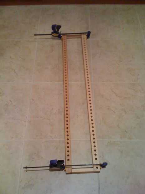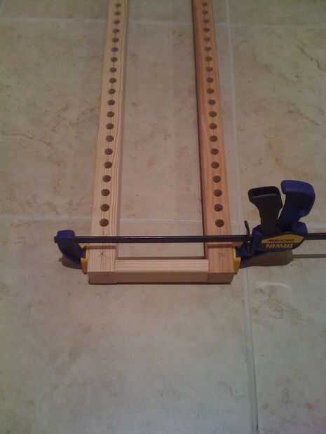 Aquí estoy usando las abrazaderas para mantener las piezas juntas. También puse algunos pegamento para ayudar a la instalación de la clavija. El pegamento me permitirá retirar las abrazaderas, taladre los agujeros para instalar las clavijas.