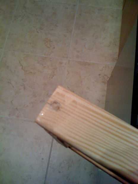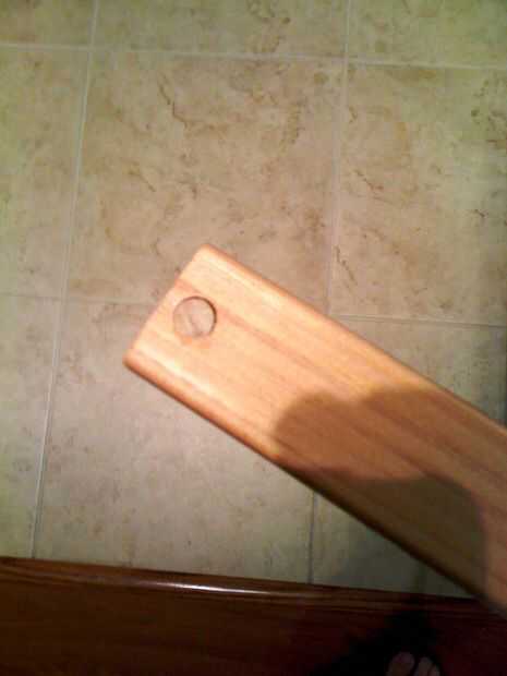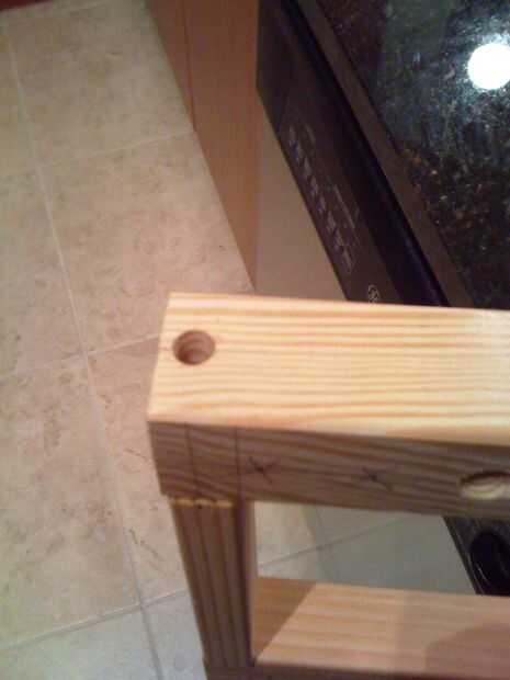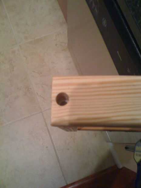 Se perfore con el 3/8" bit, taladrará 3" de profundidad. Una vez que Taladre los agujeros, poner un poco de pegamento en el agujero (realmente, sólo un poco) e instalar las clavijas. Puede que necesite un martillo para asentar la clavija en lugar