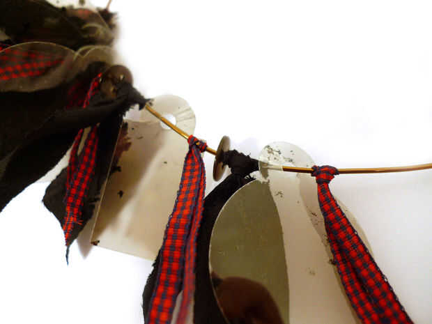 Corte de cinta en secciones de 4 pulgadas. Nudo un pedazo de cinta marcada en los 16 cable calibre por lo que son los extremos de la cinta. Nudo una longitud de dupioni junto a la cinta de equipaje. Una etiqueta de mica sobre el cable del hilo de rosca. Repito, atar revisar de la cinta, cinta dupioni y enhebrar una etiqueta mica hasta que todas las etiquetas de mica se roscan en el cable. Después de la etiqueta final mica ha enhebrado en el alambre, ate un trozo de cinta de equipaje y un pedazo de dupioni en el cable. Deslice la mica y cinta en el alambre hasta que están centrados a lo largo de la longitud.