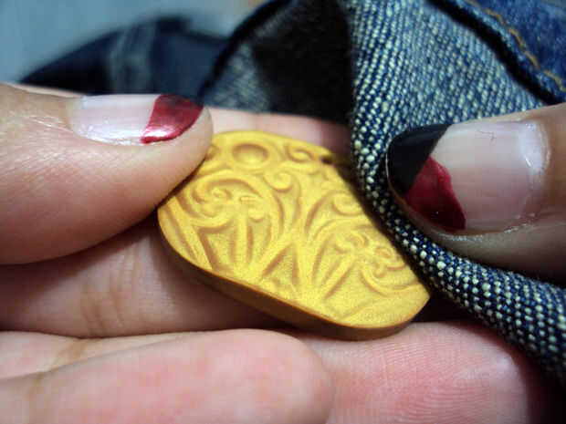 Yo uso y vieja falda de mezclilla a la arcilla, pero también puede utilizar uno de los pulidores de archivos de uñas. He leído que se puede utilizar pasta de pulir (algo acerca de estropear la arcilla), pero no he probado. Asegúrese de que la arcilla está seca y empezar a frotar el denim o el archivo contra la arcilla del polímero, lo hago en círculos pequeños por ninguna razón en particular. Sólo se tarda 2 o 3 minutos de pulido y está listo!