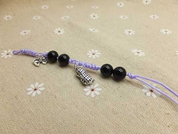 Continuar trenzado pulsera con nudo de serpiente. Hilo los dos negro ágata rebordea en cuerdas cuando su longitud es de aproximadamente 2 cm. atar otro nudo de conexión doble después de enhebrar las cuentas.