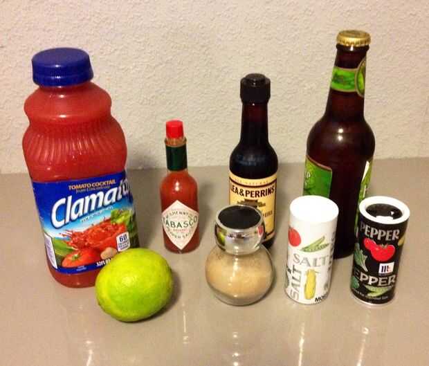 Un vaso Hielo Sal Pimienta Sal de apio Tabasco Clamato o V8 Salsa Worcestershire Cerveza (puede usar cualquier cerveza con cuerpo, nacionales o de importación).