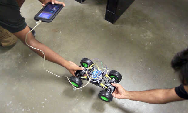 La aplicación Dashboard MICILE puede utilizarse para decir cual cable controla girando a la izquierda, giro derecha, movimiento hacia adelante y moviendo hacia atrás. MICILE tablero de instrumentos tiene una interfaz de usuario que permite pulsar un botón que activa un pin en la placa de Arduino que luego activa el circuito de RC carro. Utilice la aplicación de tablero de Arduino MICILE para activar los pines de Arduino y off para cada función de prueba. ADVERTENCIA! Si enciende tanto dirigir izquierda y dirigir justo al mismo tiempo que causar un corto circuito en el puente H y probablemente hacerlo explotar. Lo mismo ocurre cuando se trata de ir hacia adelante y hacia atrás al mismo tiempo.