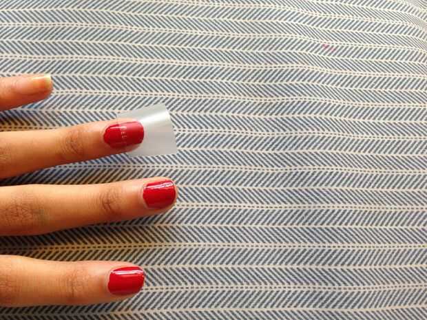 Aplicar un trozo de cinta sobre la uña del dedo anular que cubre la mitad de la uña.