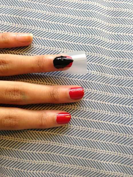 Usar el negro (o sustituto del negro) esmalte de uñas para pintar sobre la parte de la uña del dedo anular no cubierto en cinta.