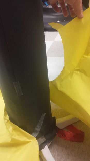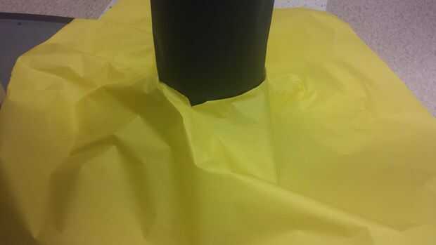 Agarra un papel amarillo y cortar una línea a la mitad en el papel. Una vez en el centro del papel recortamos un pequeño círculo aproximadamente el mismo tamaño que nuestro Polo. Sin necesidad de ser exactos aquí como vamos a manojo en la base como una falda para disimular las piernas en el soporte del árbol.