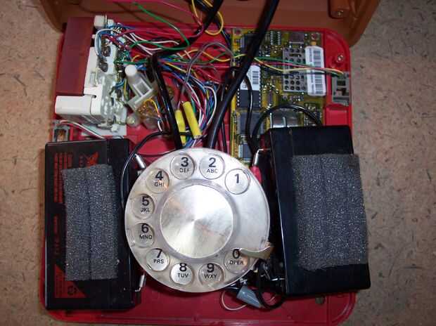 Siguiente tomé las tripas de un Motorola teléfono de bolso con una caja de conexión de datos celular junto con algunas baterías les puede rellenos en donde podría conseguirlos para adaptarse. Tuve que trasladar el transformador de linea pero no es es gran cosa.