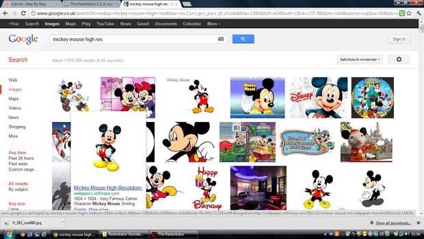 Goto google y tipo 'mickey mouse alta res' para encontrar imágenes de alta resolución. (cuanto mayor sea la resolución, mejor calidad cuando se la amplía).