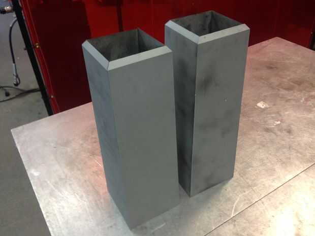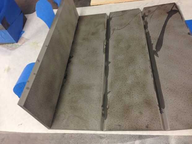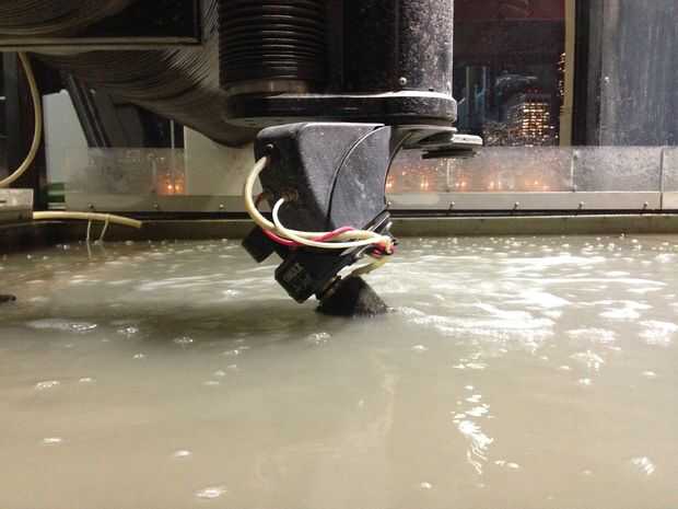 Parte de la pieza es un contrapunto a la ligereza del 3D imprimieron objeto. Decidimos utilizar el 5 º eje de Omax en muelle 9 corte biselado y afilado bases. Estas bases son entonces ensambladas como una caja. Con bisel de 45 grados en todos lados hemos sido capaces de construir una pieza que encajan perfectamente... en teoría. Parece que el chorro de agua no es precisa en A jet y hay alguna variación angular hacia esquinas desalineadas.