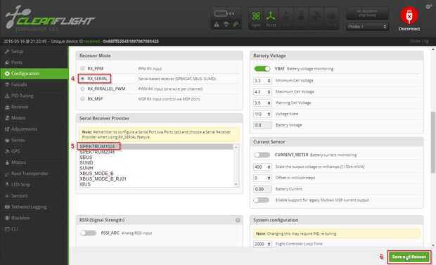 - Seleccione "SPEKTRUM1024" de la lista de "Serial Reveiver proveedor".
