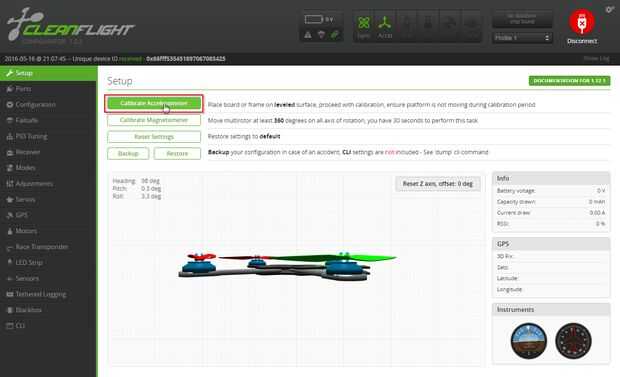 Coloque su quad en una superficie nivelada y golpe "Calibrar acelerómetro".