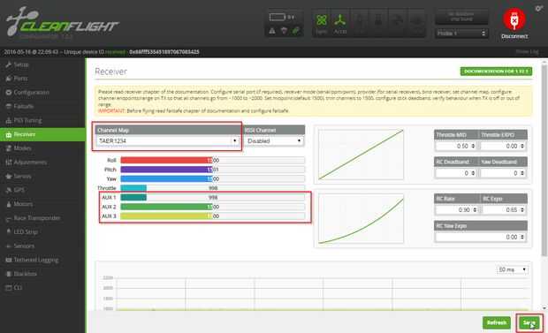 Mover los palillos en su radio y de observar los valores del canal. Si los canales que están cambiando en el configurador no coinciden con lo que espera en base de la palanca que mueve, cambia el "mapa de canal" hasta que. Nota: se necesita darle "Guardar" antes de los cambios de "Canal mapa" afectan.