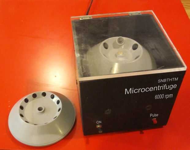 El mayor desafío es en la fabricación de un rotor de centrífuga correctamente equilibrada que contiene los tubos. En eBay utilizados rotores están disponibles a precios bajos. Un sistema de dos rotores de centrifugadora plástico gris (una de 0.5 ml de tubos otro para tubos de 1,5 ml) nominal de 7,000 rpm fueron comprados para $12.