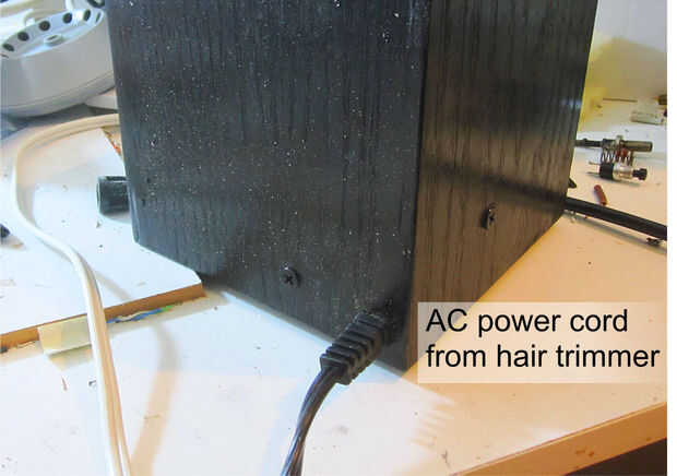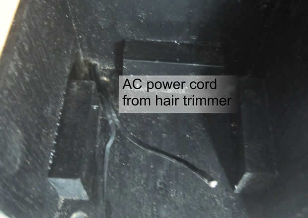 - Cable para entrada de corriente alterna de alimentación. Había a la izquierda con cable de alimentación de un cortapelos tan apegado este a través de la pared posterior de la caja de la centrifugadora por dos agujeros conectados y expansión en un pequeño agujero rectangular. El extremo libre del cable fue tirado a través.