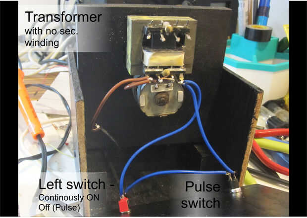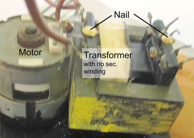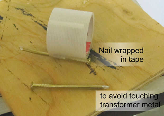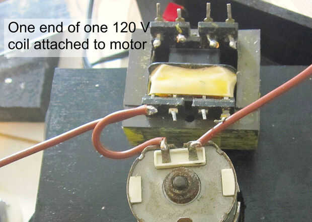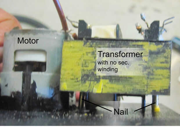 - Conectar el transformador a la placa base. Ya había soldar dos cables al motor para probar así que acortado uno de estos y unido a un extremo de la bobina primaria del transformador. El transformador fue un ajuste apretado entre la placa central y la base (accidente fortuito!) así que sólo tuve que evitar resbalar alrededor. El transformador tenía dos agujeros existentes a través de la base del metal. Yo no tenía clavos (para uso con soportes de bastidor) de bronceados dos tornillos fino y bastante largo por lo que utiliza y la clavó el transformador a la placa central. Las uñas estaban cubiertas con cinta plástica antes de clavar a través de los orificios existentes en el transformador para prevenir cortocircuitos de la base de transformador (crear las corrientes de Foucault).