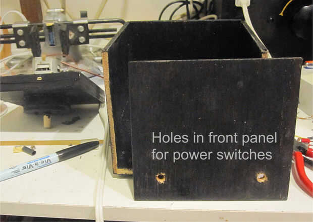 - Colocar los interruptores de. Decidí usar conmutador de 2 vías de 1-Polo CA y momentáneo en conmutador de CA. El interruptor de dos vías conecta el transformador directamente al motor o a través el interruptor momentáneo en CA. Esto me permitiría a pulso el rotor para giros rápidos o continuamente. Yo corte dos agujeros para los interruptores en el panel frontal. El polo central del interruptor de dos vías fue cablear directamente al cable en vivo desde el cable de alimentación. Una terminal del interruptor era soldado a la conexión externa del transformador y el otro extremo fue soldado a un poste del interruptor de encendido momentáneo. El otro polo del interruptor momentáneo-ON también fue soldado a la misma conexión exterior del transformador. Las dos bobinas primarias separadas del transformador eran puente con un cable de la conexión restante del motor. El diagrama de cableado muestra esto más claramente.