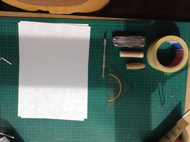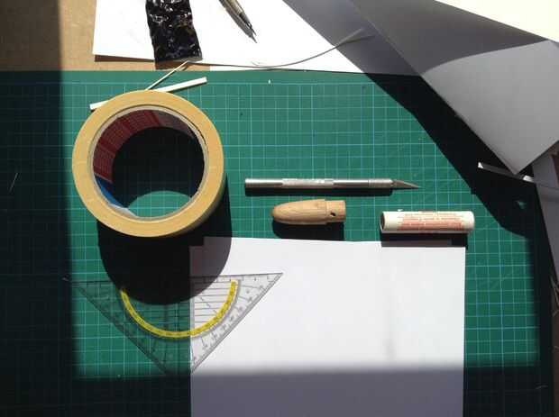 Violonchelo cinta, cinta de doble cara, papel grueso (> 250g/m ^ 2), el motor del cohete (weco o Estes, fáciles de encontrar en línea y en algunas tiendas de Museo), regla, tabla de cortar, cuchillo, punta madera (no es necesario)