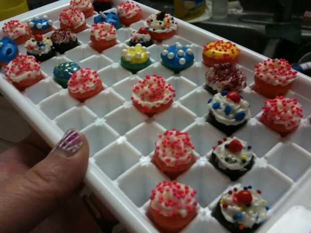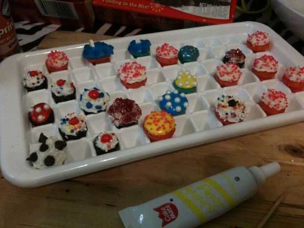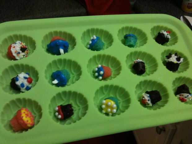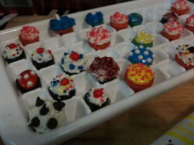 Para los rojos y amarillos, a usar las cosas de escritor cakemate y pulsado decoraciones en ellos antes de que endurecieron. Si desea que los sprinkles a ligeramente en la parte superior, sólo caer tan pronto como usted les de hielo. Si usted quiere presionar en, para otra mirada fresca, (la imagen de cumpleaños en el video), solo espere unos minutos para que el glaseado se endurezca un poco, luego presionan en la guinda. Los pequeños azules que son suaves, son mis tiburones, jajaja. Usé la cosas cakemate, punto azul granas y Halloween fantasma chispitas dada vuelta al revés a la aleta de tiburón.