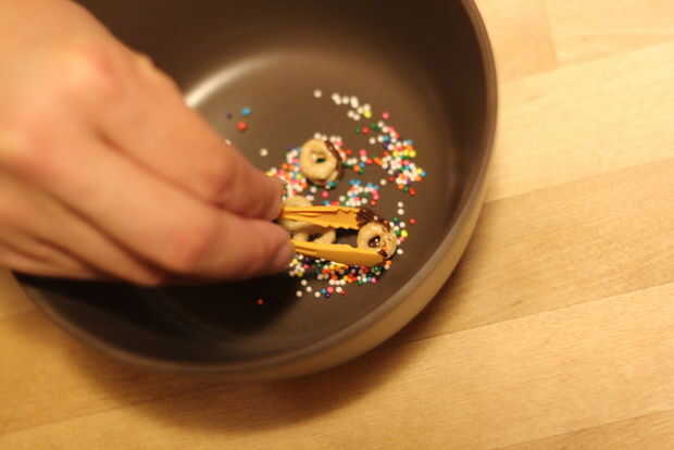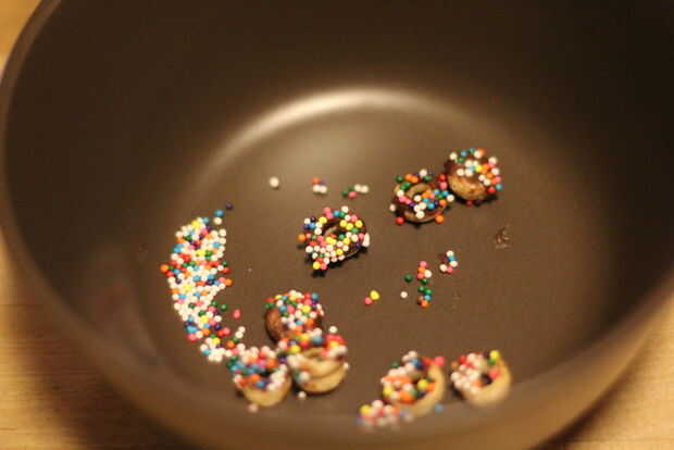 Fundir el chocolate en el microondas al 50% de potencia, no derretir demasiado rápido o se quemará. Cuando listo utilice pinzas de itty bitty para sumergir sus donuts de chocolate (o palillos de dientes tal vez?) y luego transferir los donuts medio sumergidos en el recipiente espolvorear. Deje secar en las granas.