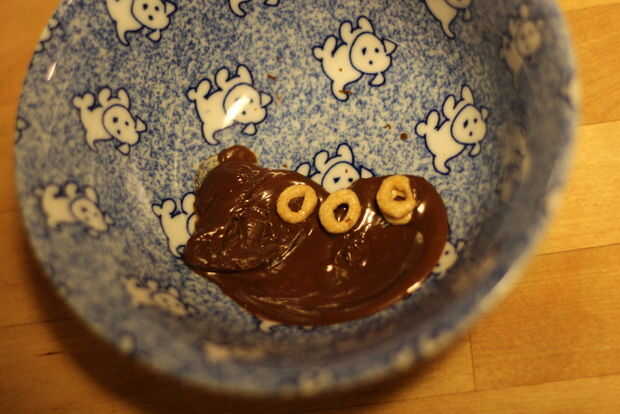 Para los donuts de chocolate solo Voltee los cheerios llano una vez recubierto de un lado, esto hará que buscar chocolate. Punta en sus lados y deje secar. Si no a punta a sus lados serán dificiles de eliminar del tazón de fuente.