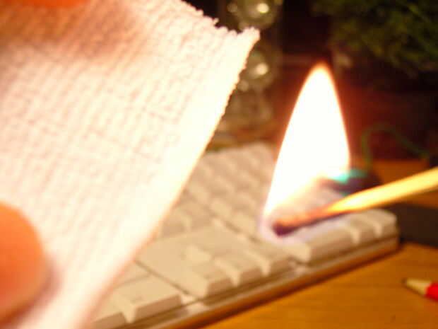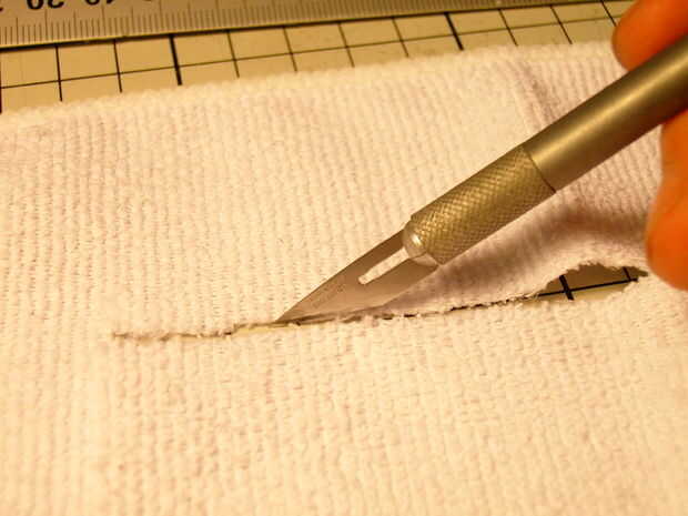 Una vez que se han cortado tho lados estará abiertos y las cuerdas comienzan a soltarse, dejar esto Haz un fósforo o un encendedor y los lados de la tela de la chamusquina, esto derrite las fibras hacia atrás juntos.