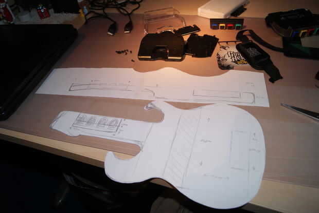 DS abierto) en un papel DIN A3. Luego dibujar una forma de la guitarra alrededor de él que es lo suficientemente grande como para sostener con seguridad el DS. Elegí un estilo clásico (