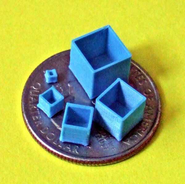 El ancho mínimo de una sola pared es de. 018". Esto limita el tamaño de los objetos más pequeños que pueden ser impresos. Paso 6 pic muestra un conjunto de cajas de anidación en un cuarto. La caja más pequeña es de. 07" x. 07" interior cavidad de. 027" x. 027". El cuadro más grande está sobre. 30" x. 30".