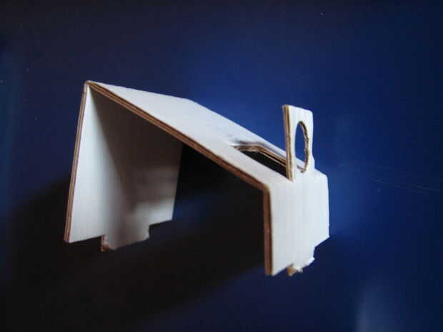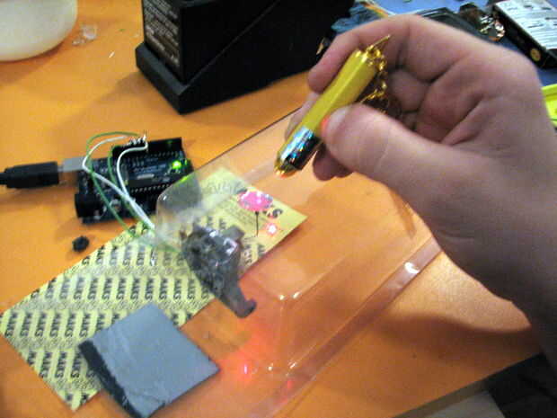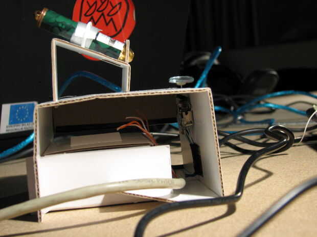Para finalizar, coloque el puntero permanentemente en un ángulo mirando hacia abajo, apuntando hacia el espejo. Aquí usted tendrá poco de ingenio. Los detalles de esto dependerá lo que usas para la vivienda y lo tienes a la mano. En las fotos que se puede ver la parte utilizada en el cartón original vivienda a Bjorn de Origatronica fama me ayudó a hacer.