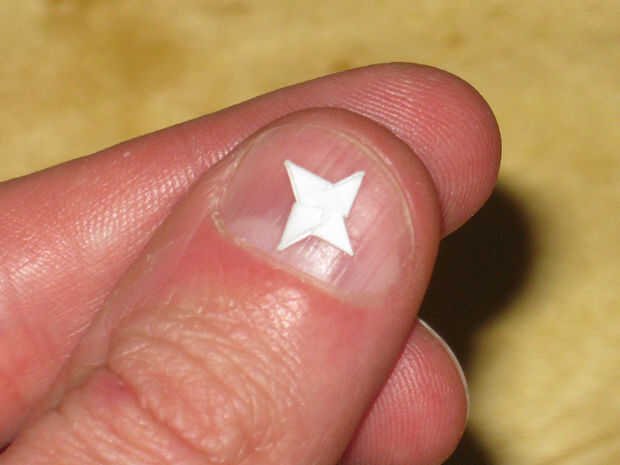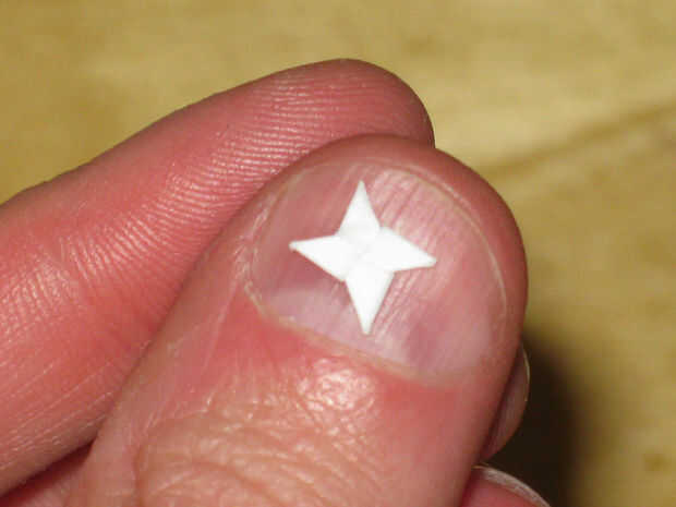 Todos los pliegues donde hecho a mano. Debido a lo pequeño de la estrella tenía que usar un alfiler para obtener las última 2 esquinas en lugar.