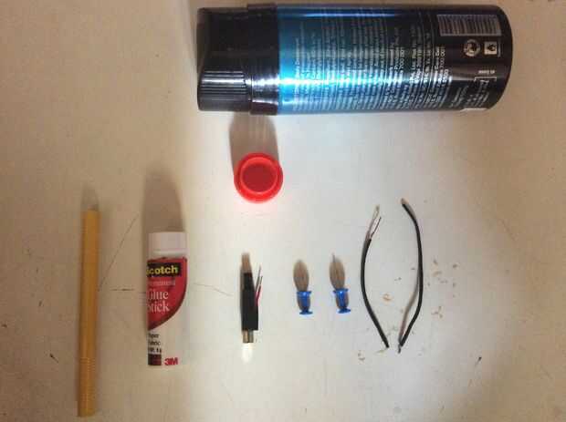 1) portaminas 2) pegamento palo tubo hueco 3) 2 thumbtags 4) alambres 5) cuerpo desodorante 6) cinta adhesiva y pegamento 7) encendido.