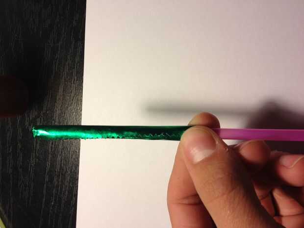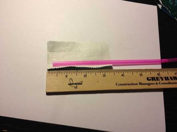 5 suavemente Deslice la envoltura por la paja hasta que la marca que hecha un poco más allá del extremo de la paja.