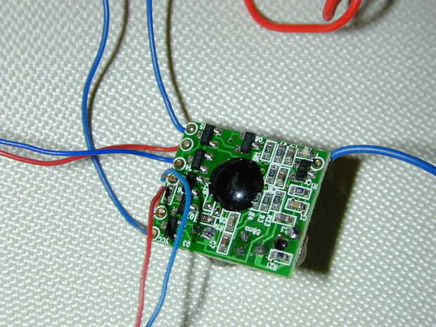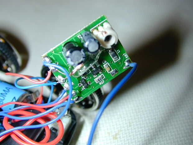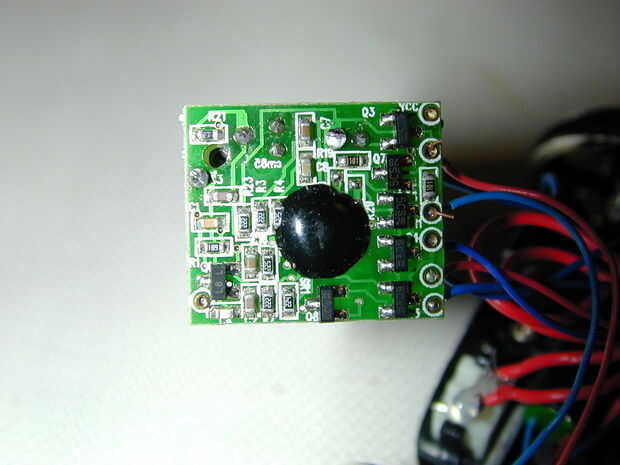 Es el receptor de radio control en un tablero pequeño agradable que está sorprendentemente bien. Puesto que hay dos motores para el control en este coche, hay dos controladores de motor completamente reversible. En el lado negativo, el Consejo utiliza la "viruta del a bordo" (la "inteligencia" principales es un un chip desnudo bajo esa gota de plástico negro), por lo que algunas de las modificaciones posibles en receptores con chips de identificación y pernos no son posibles aquí.)