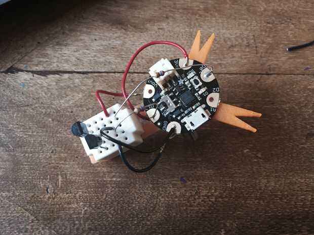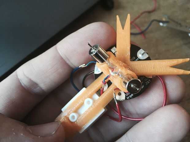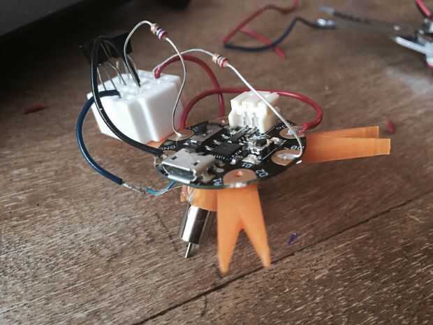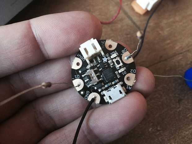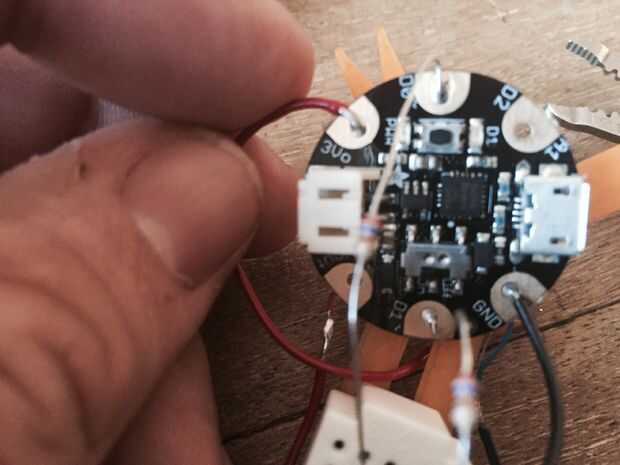 Lo de resistencia de primero es soldar la 270. Una al pin D0, y la otra al pin D1 del Gemma. También hay soldar un cable corto al GND. Ya el cautín está caliente, soldemos el cable del centro de los motores, el tiene soldado un cable rojo con uno azul del motor DC, a la conexión de 3Vo tiene el Gemma (todo se ve en las fotos).
