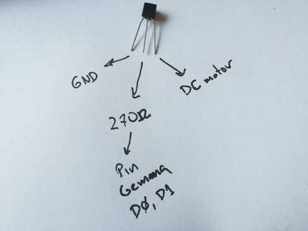 COn la parte plana de frente, en la foto se ve como conectamos el del transistor. La pata izquierda, la conectamos a tierra, la del centro una de resistencia de una 270 Ohmn, y la derecha la conectamos directo al motor DC.